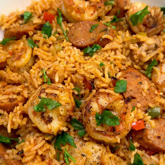 Enjoy the bold flavors of New Orleans with this hearty jambalaya! Packed with shrimp, andouille sausage, tender chicken, and vibrant veggies, it's a one-pot, spicy Creole classic that’s perfect for any occasion.