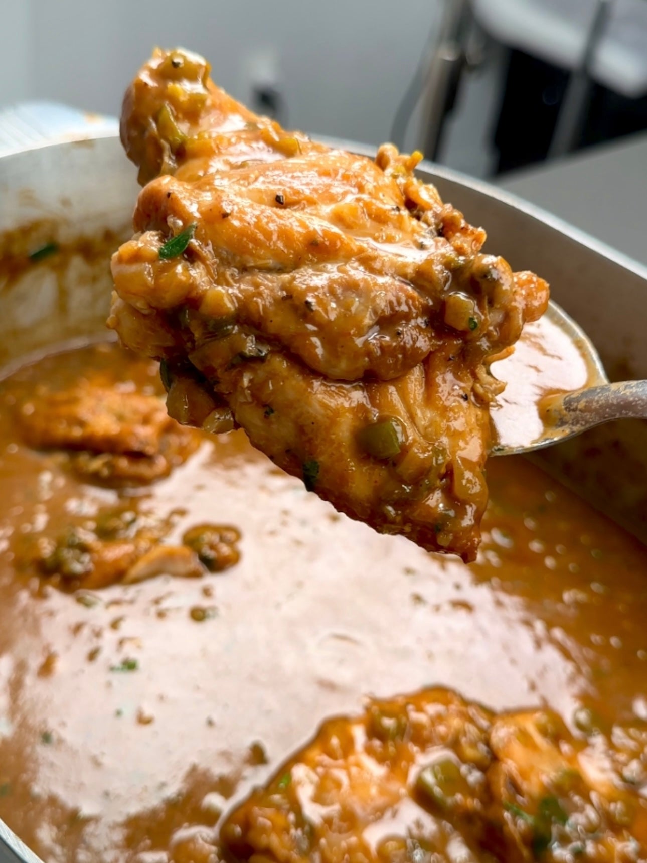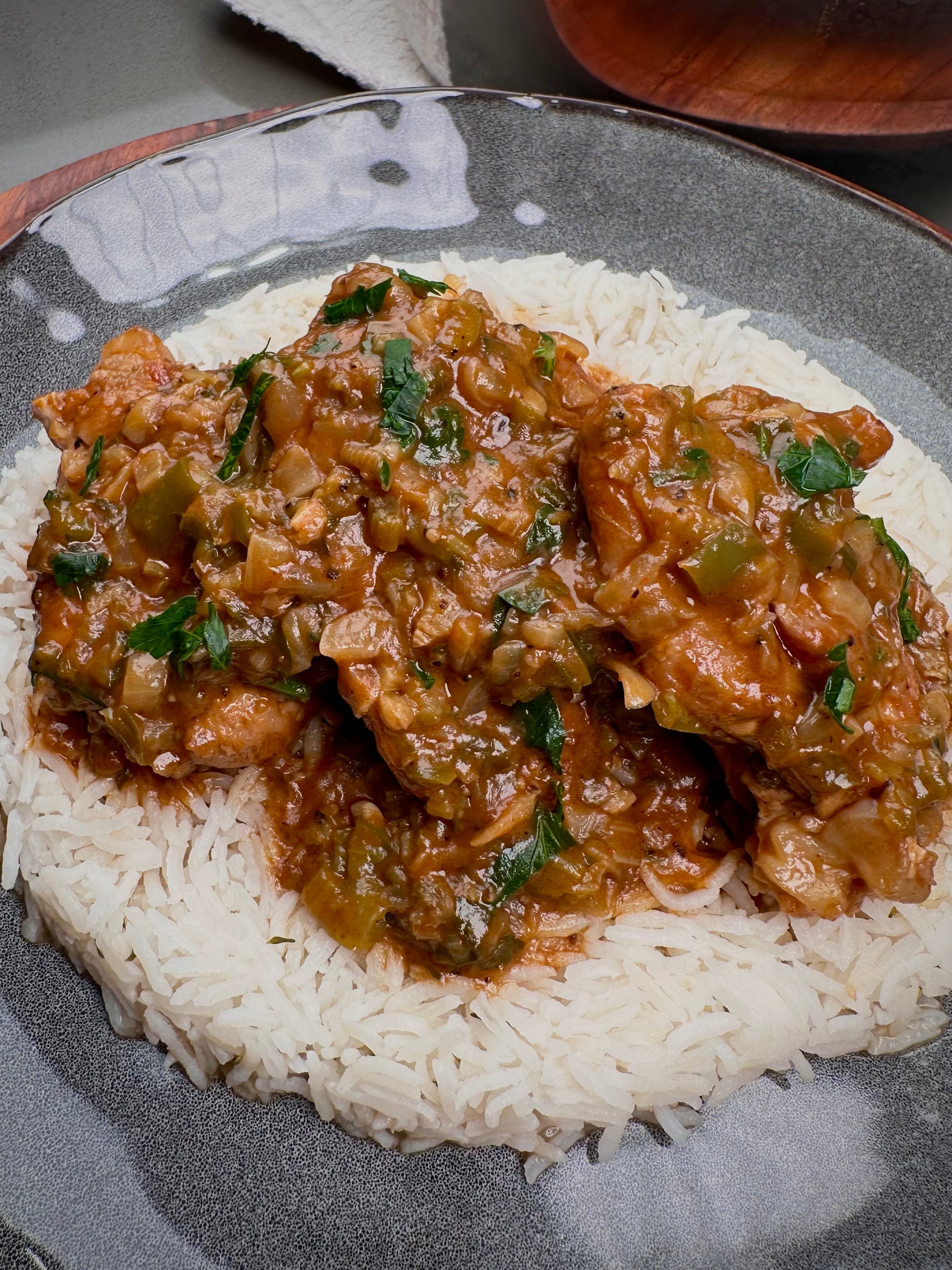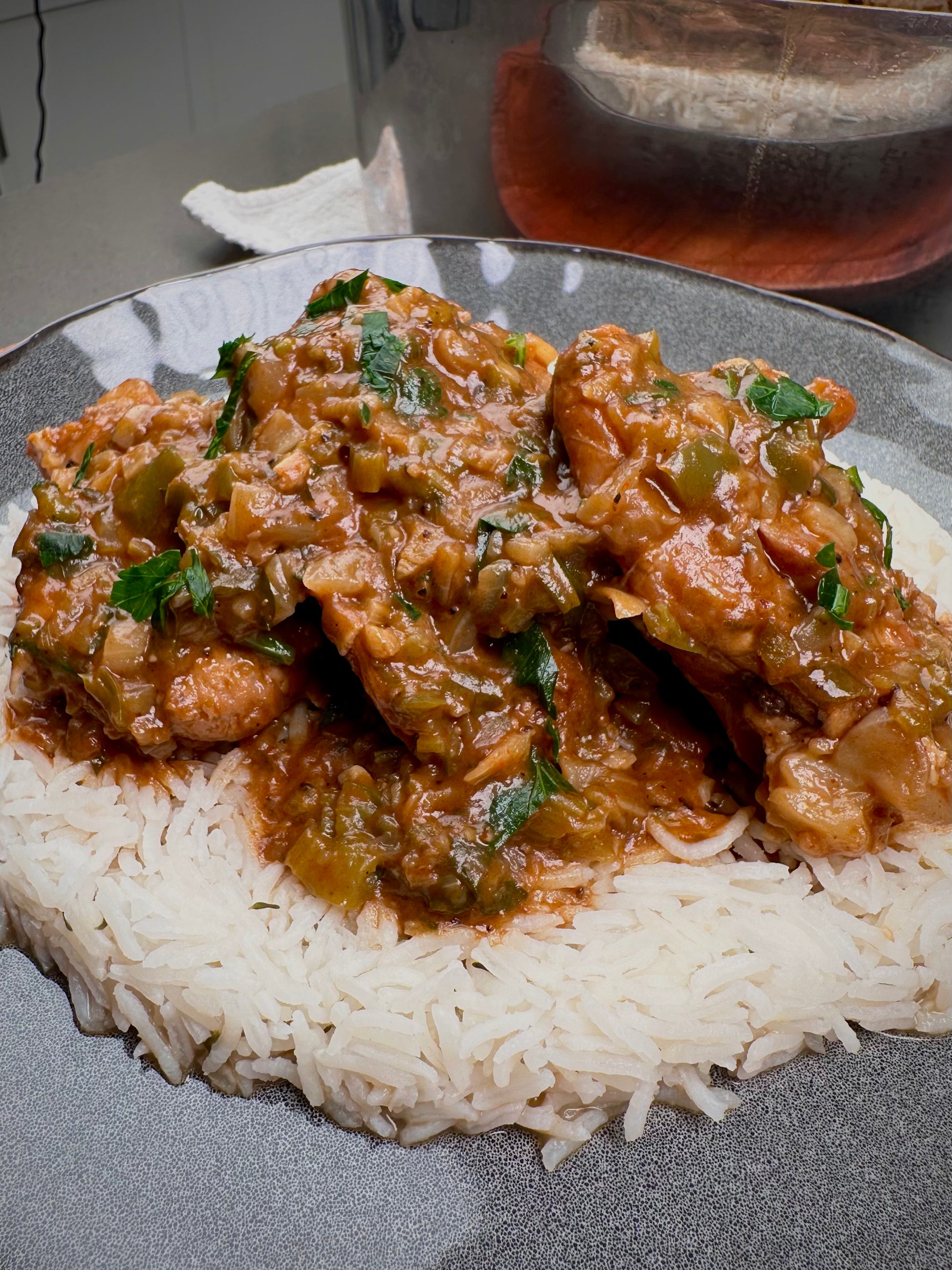 This Louisiana Chicken Fricassée is a soul-warming Southern classic, slow-simmered in a deep, smoky roux with tender chicken, fresh herbs, and bold Creole spices. Served over fluffy white rice, it’s the kind of hearty, flavorful dish that keeps you coming back for more. Perfect for Sunday dinners, family gatherings, or anyone craving a taste of authentic Creole comfort.