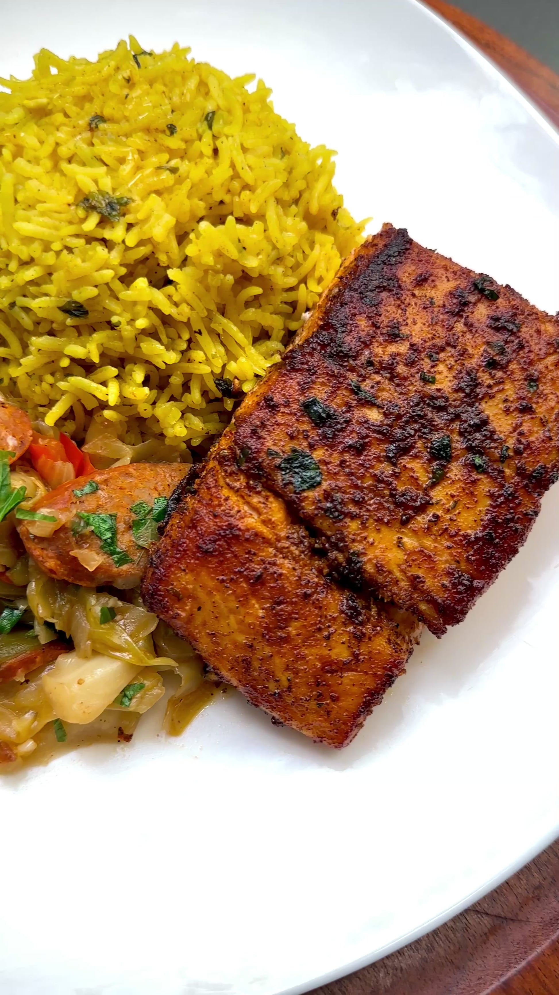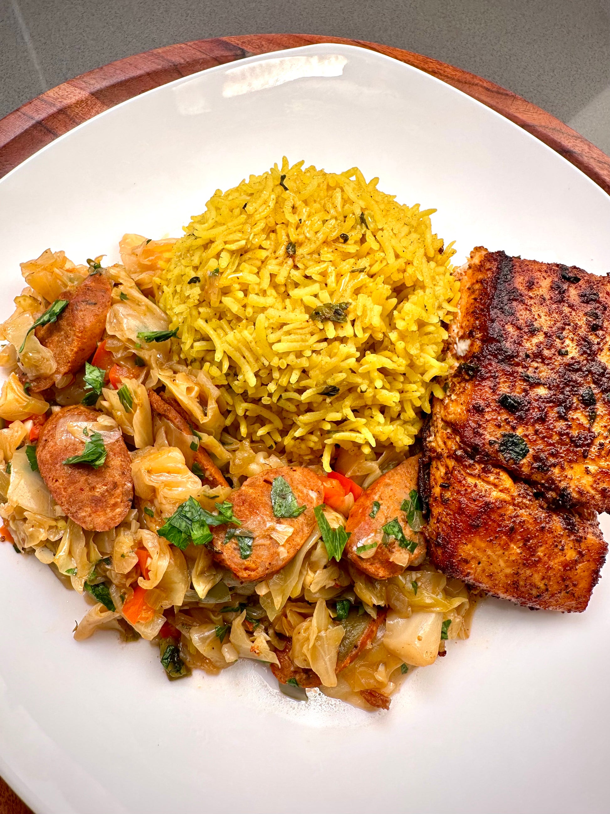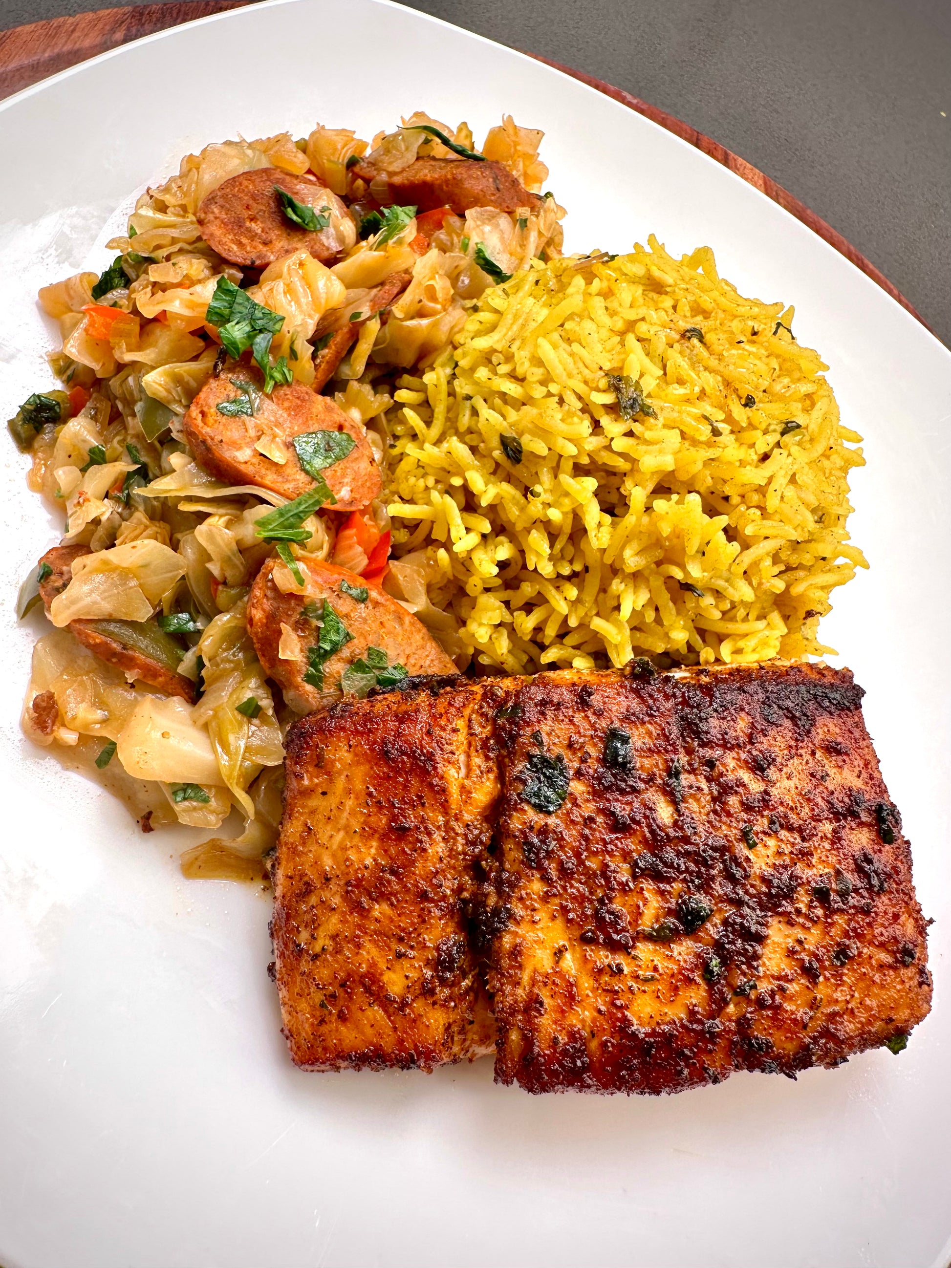 Smothered Cabbage, Yellow Rice, and Blackened Halibut